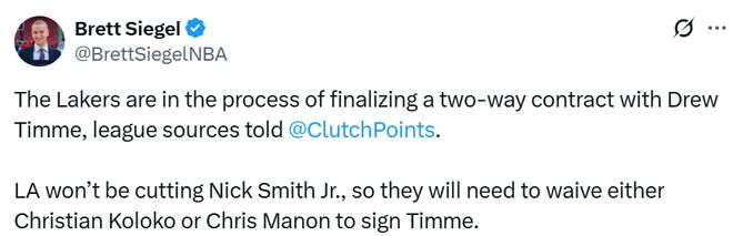 北京时间11月22日,据名记Siegel报道,洛杉矶湖人队计划与自由球员内线德鲁-蒂米签下一份双向合同。
